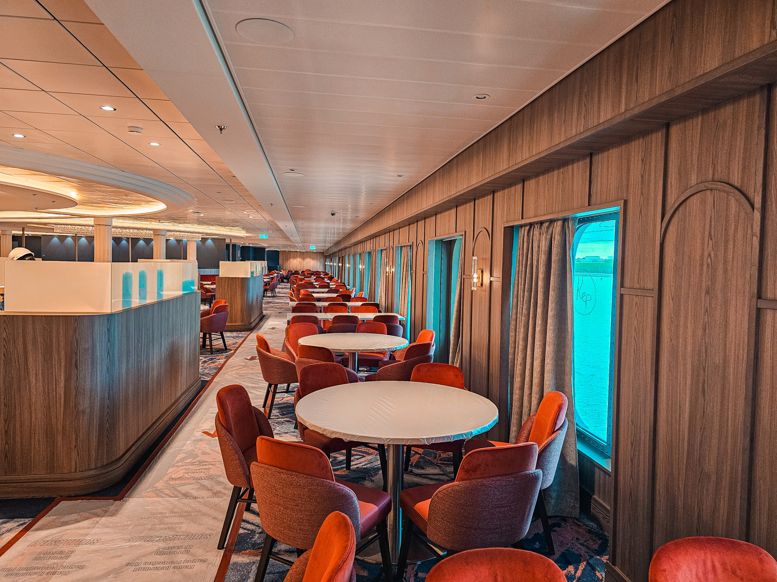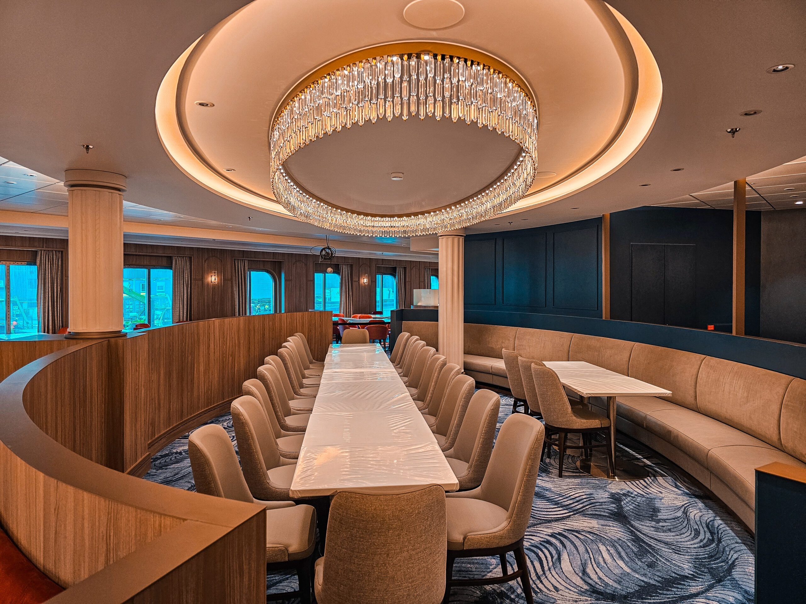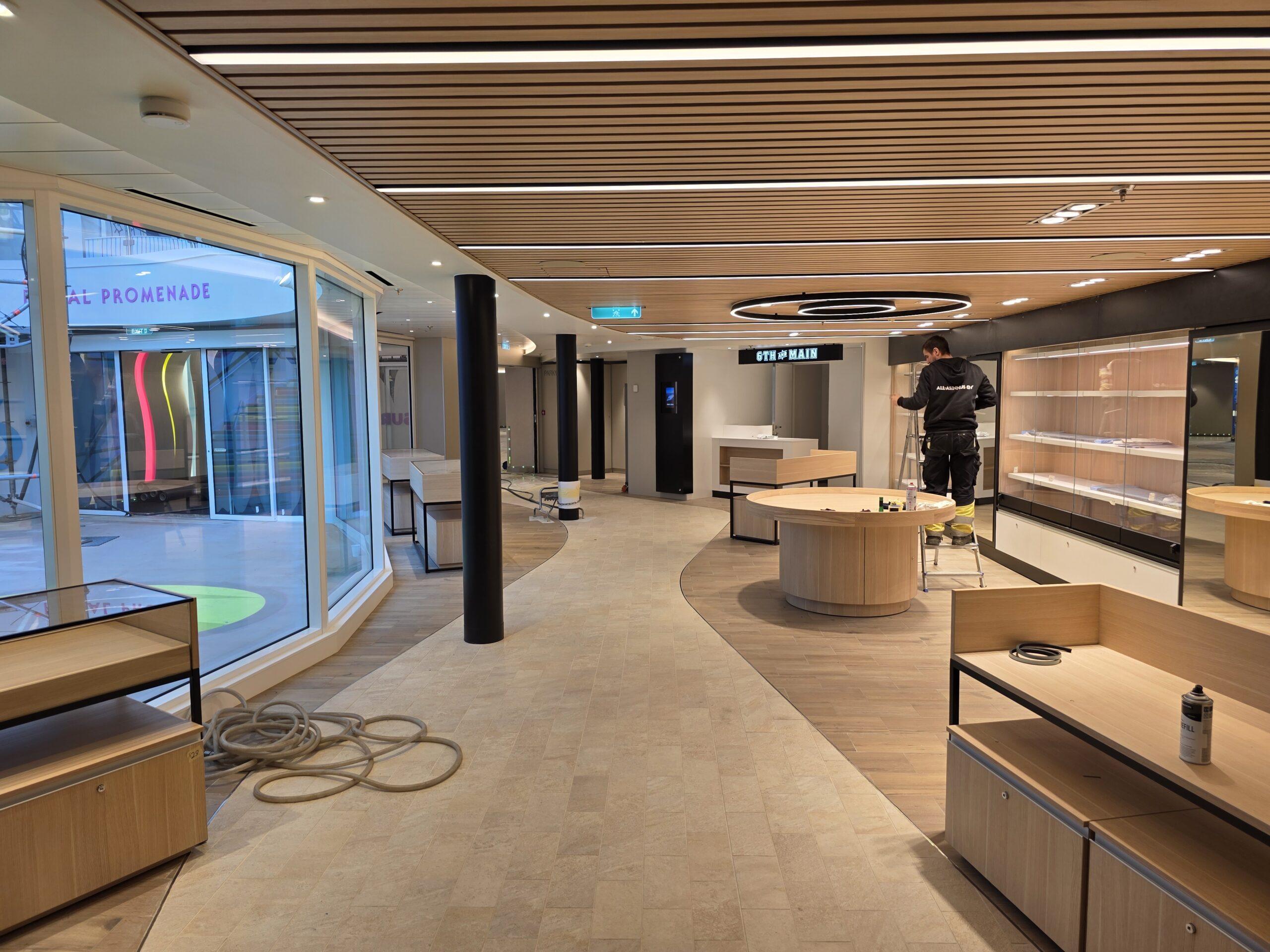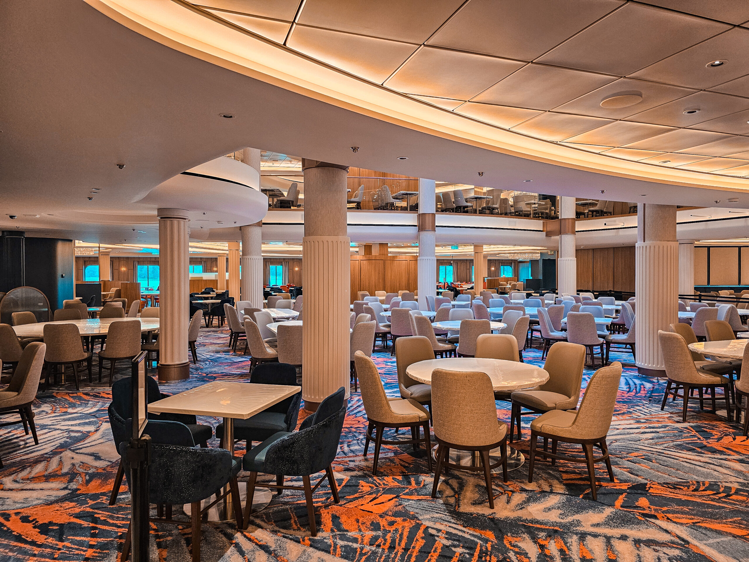 One of our main contributions on the Star of the Seas was the construction of Decks 3 and 4 in the Main Dining Area. This space is designed to be one of the ship’s central dining experiences, offering guests a large and welcoming environment with refined finishing. Thanks to our experience from the earlier vessel, the workflow was already well understood, and we were able to focus even more on craftsmanship, details, and delivering a result that feels polished and inviting. The Main Dining Area is a place we are genuinely proud to have helped bring to life.