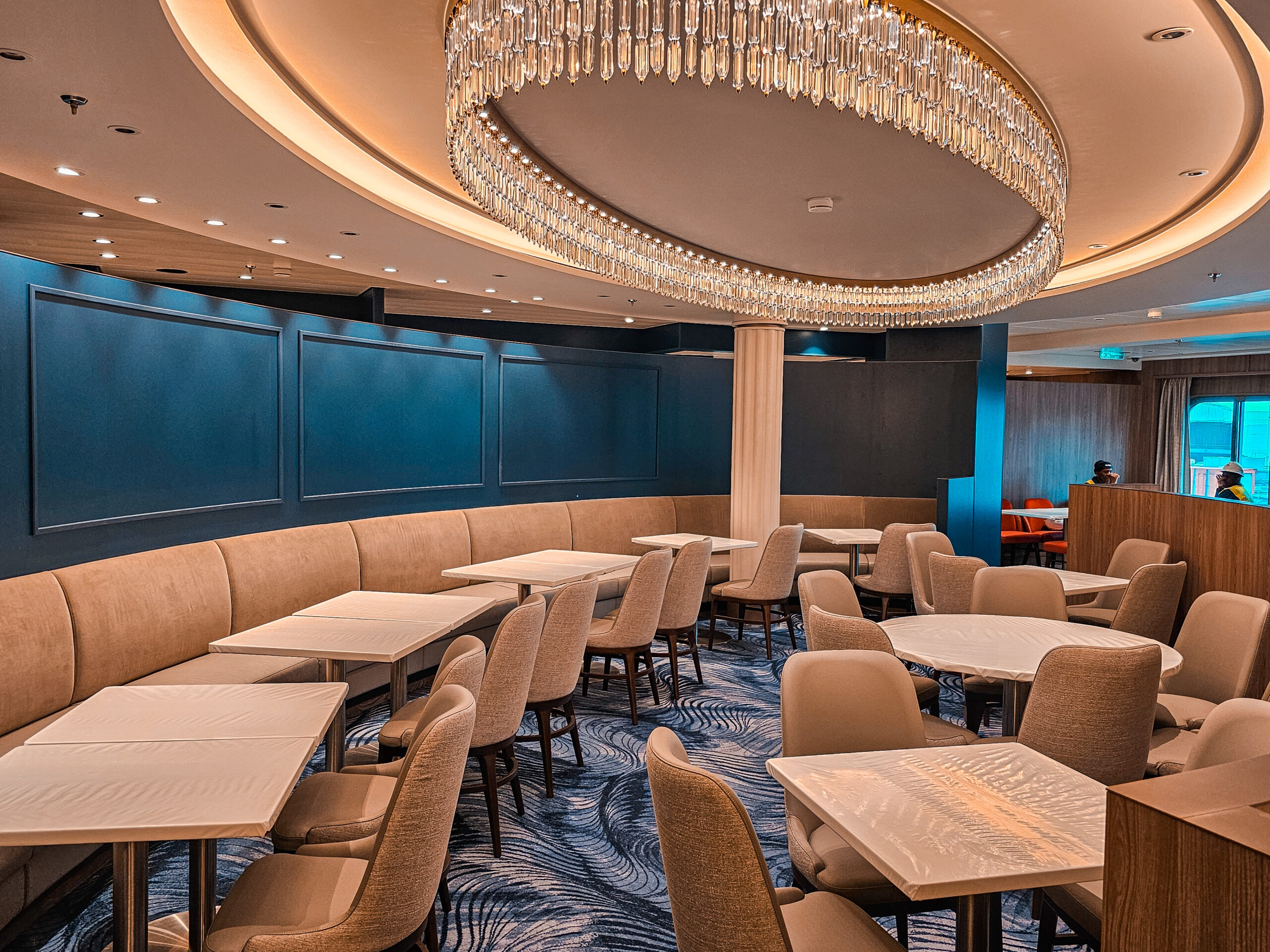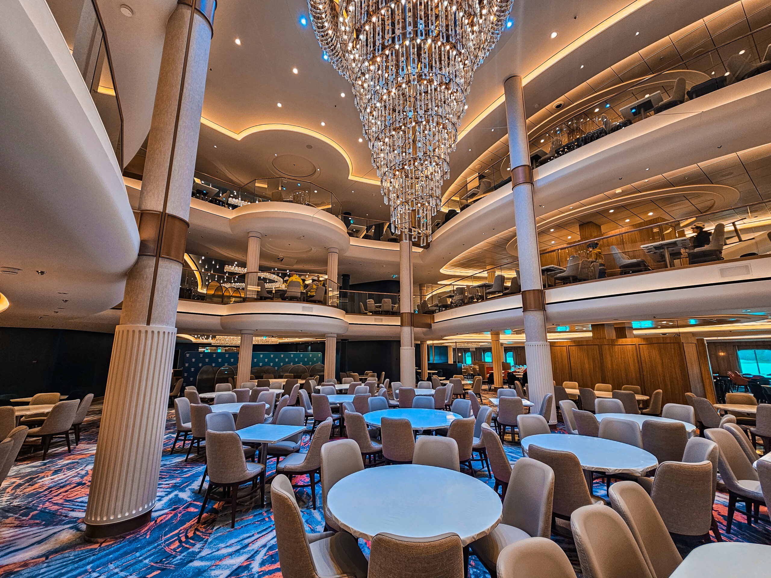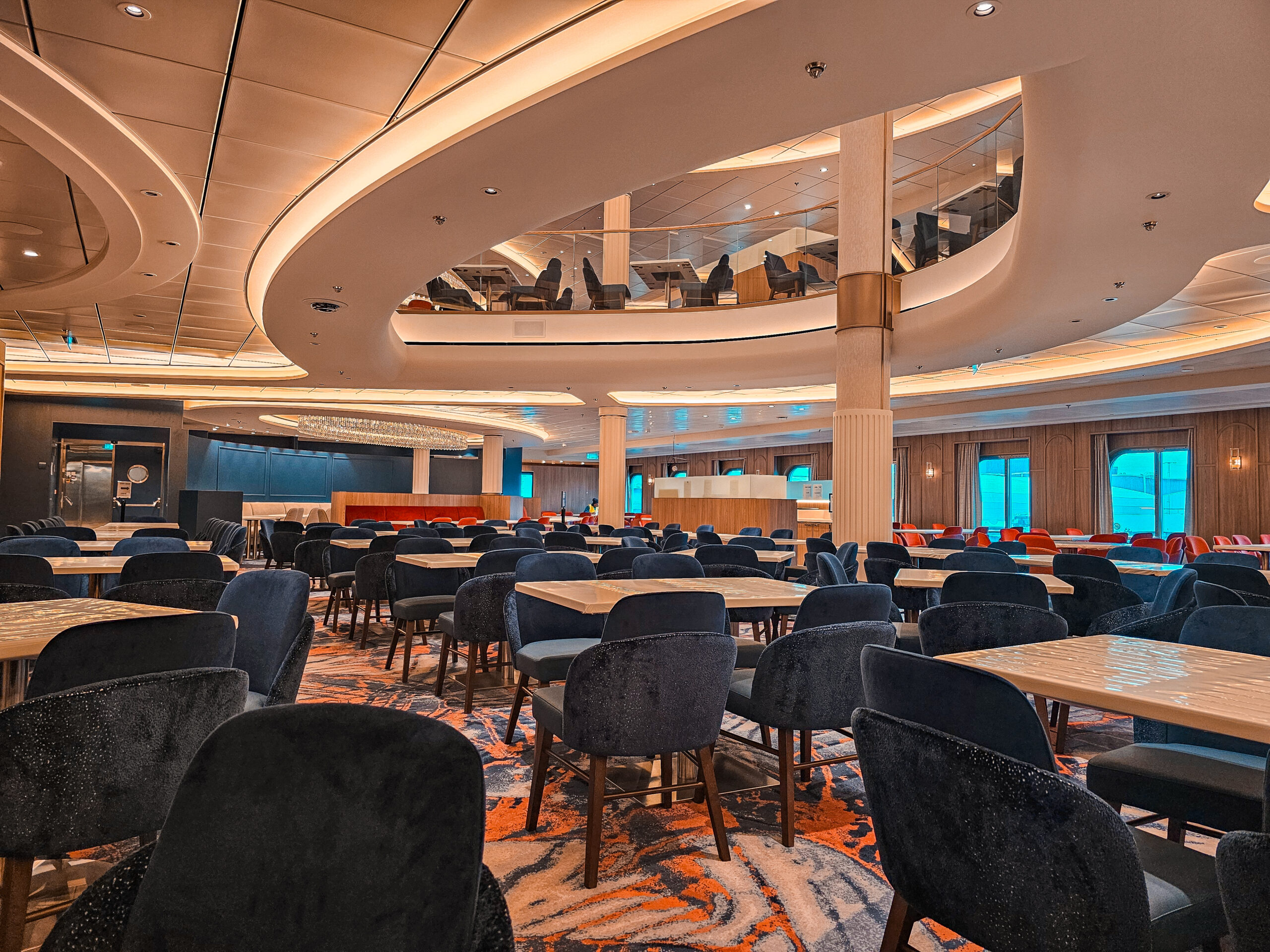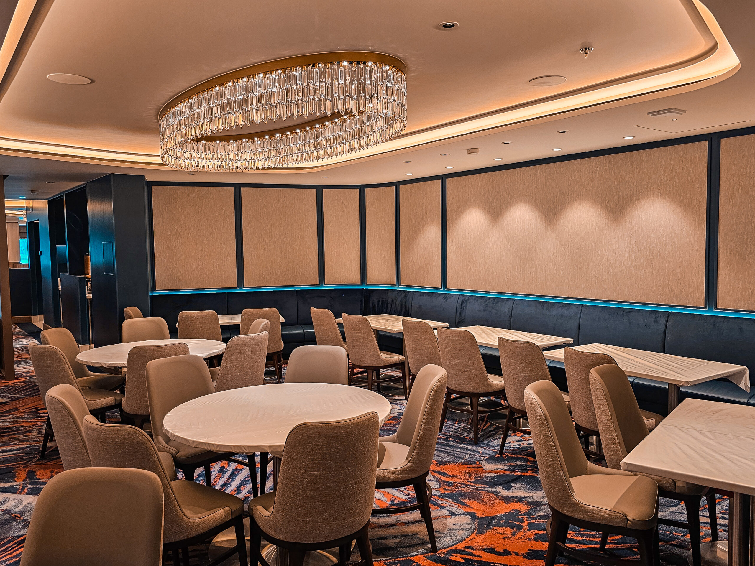 One of our main contributions on the Star of the Seas was the construction of Decks 3 and 4 in the Main Dining Area. This space is designed to be one of the ship’s central dining experiences, offering guests a large and welcoming environment with refined finishing. Thanks to our experience from the earlier vessel, the workflow was already well understood, and we were able to focus even more on craftsmanship, details, and delivering a result that feels polished and inviting. The Main Dining Area is a place we are genuinely proud to have helped bring to life.