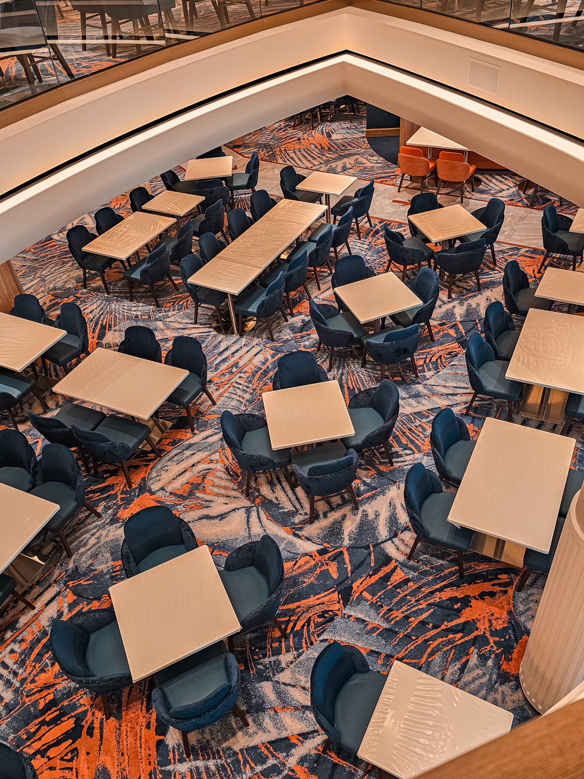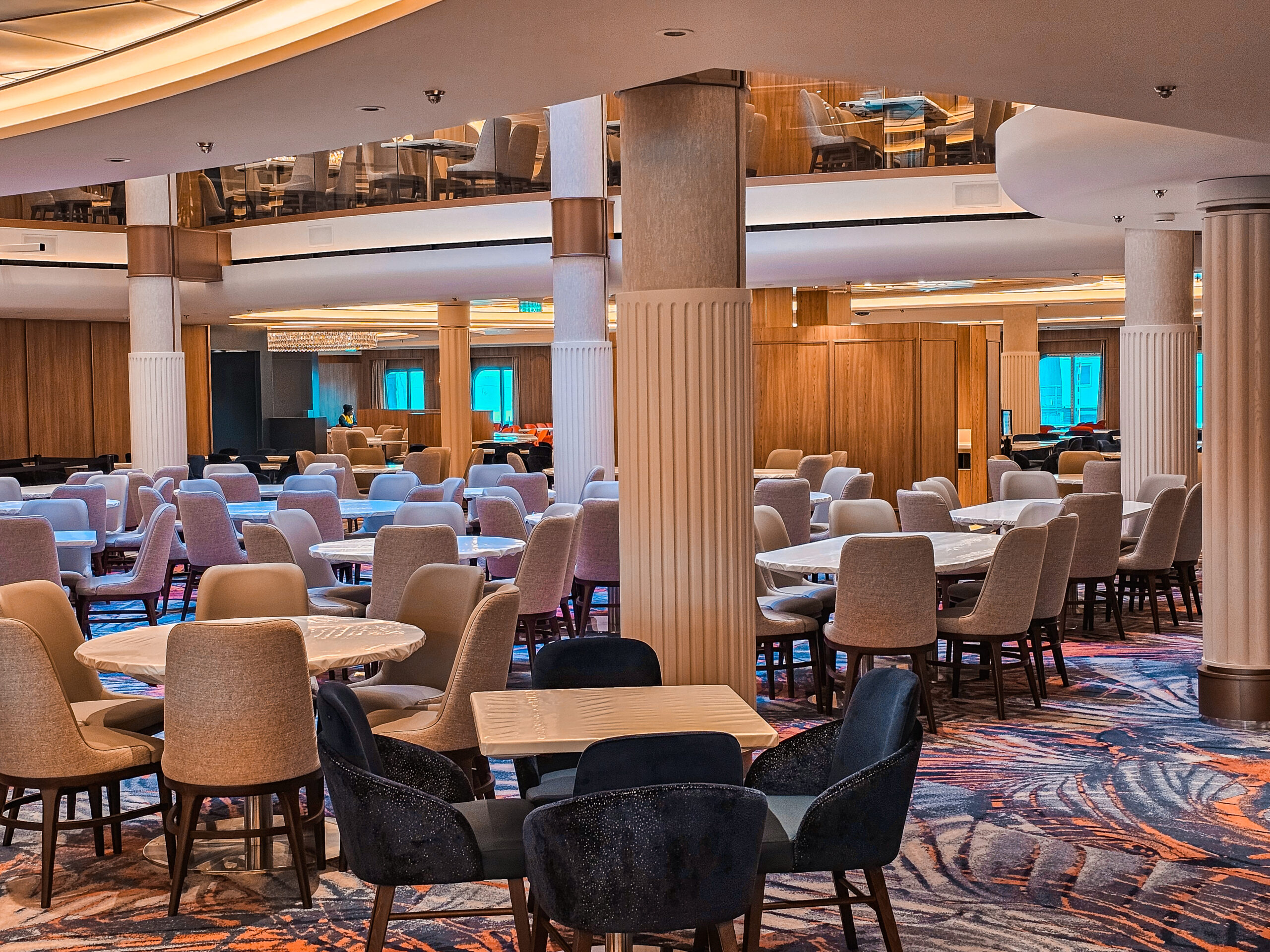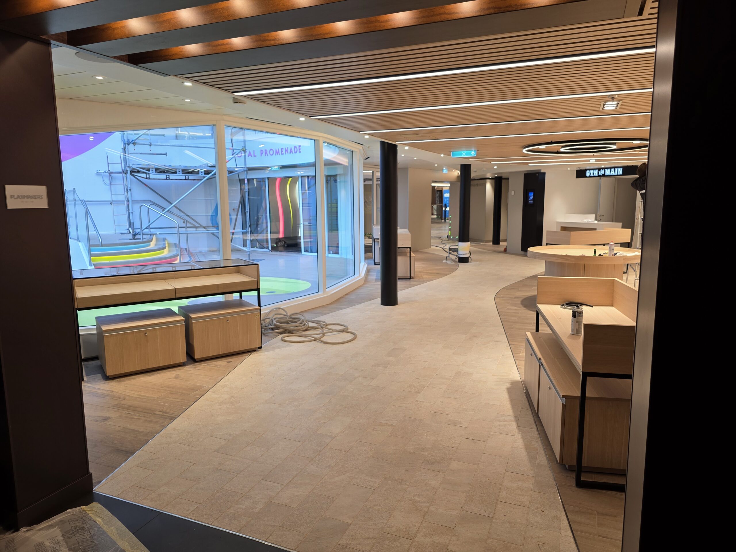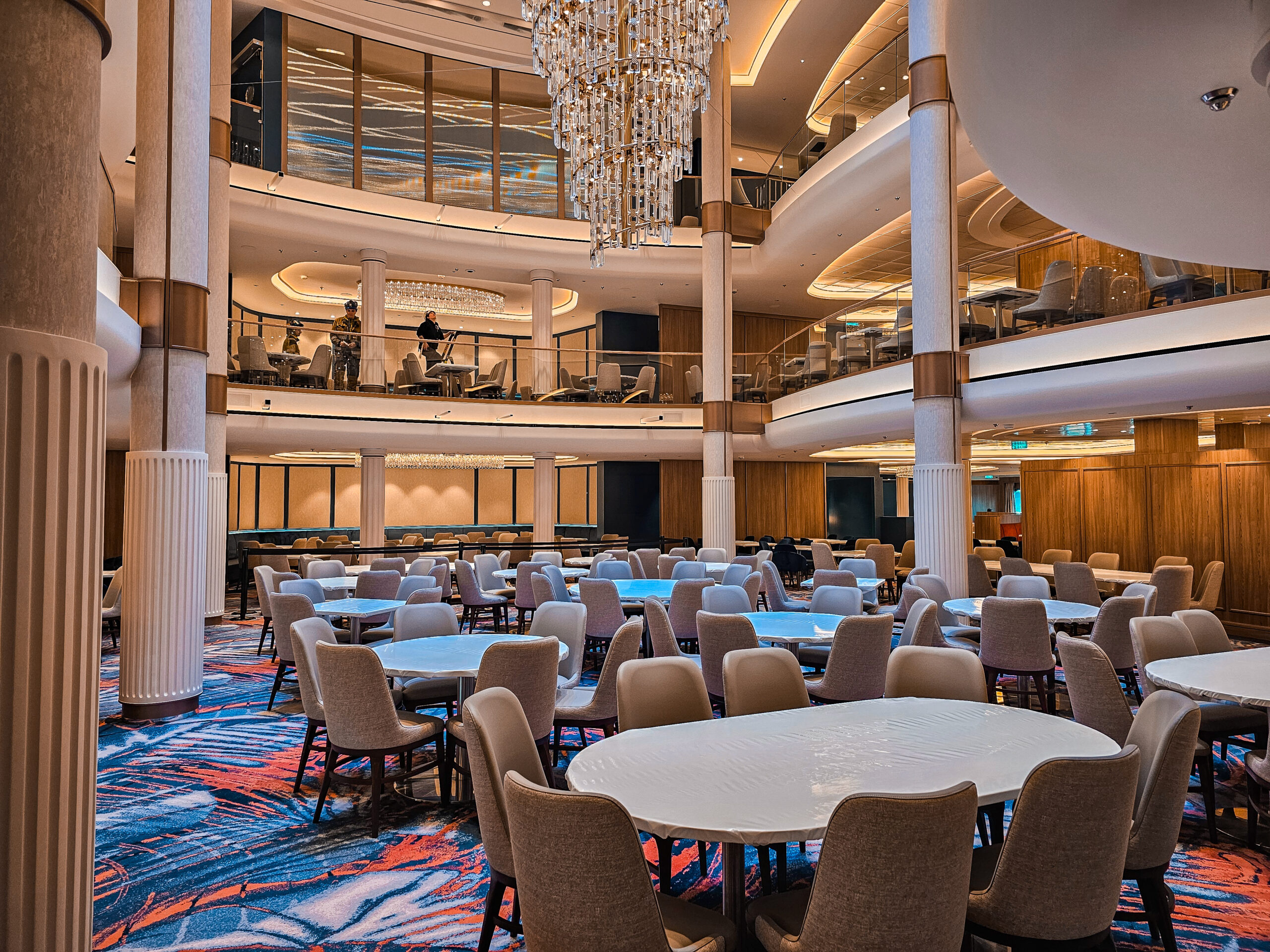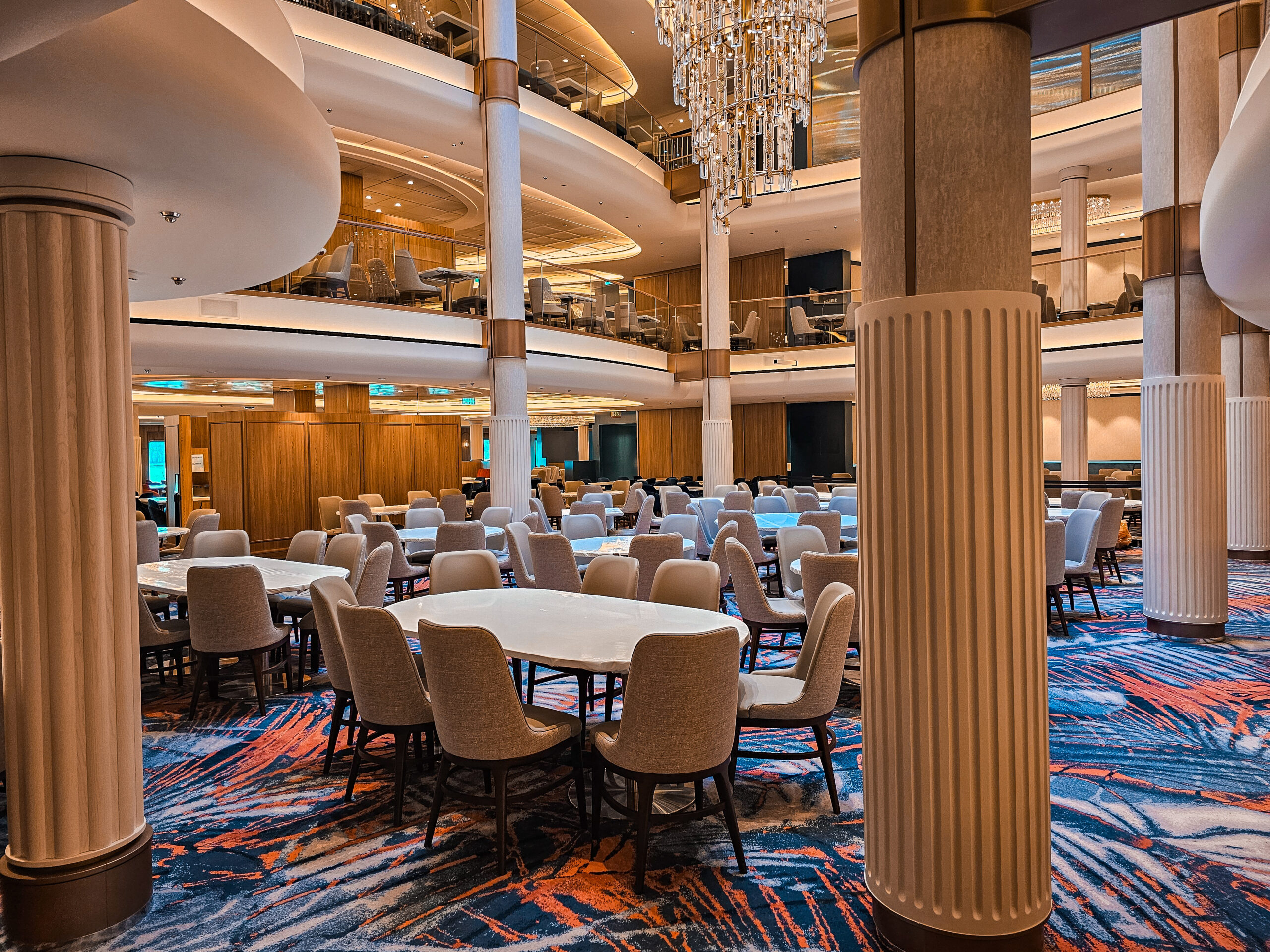 One of our main contributions on the Star of the Seas was the construction of Decks 3 and 4 in the Main Dining Area. This space is designed to be one of the ship’s central dining experiences, offering guests a large and welcoming environment with refined finishing. Thanks to our experience from the earlier vessel, the workflow was already well understood, and we were able to focus even more on craftsmanship, details, and delivering a result that feels polished and inviting. The Main Dining Area is a place we are genuinely proud to have helped bring to life.